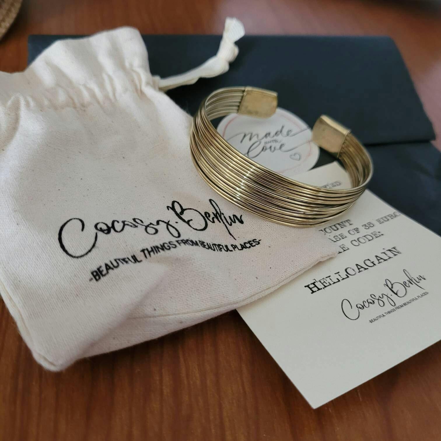 The bracelet is made of golden brass and fits every wrist; it is adjustable.