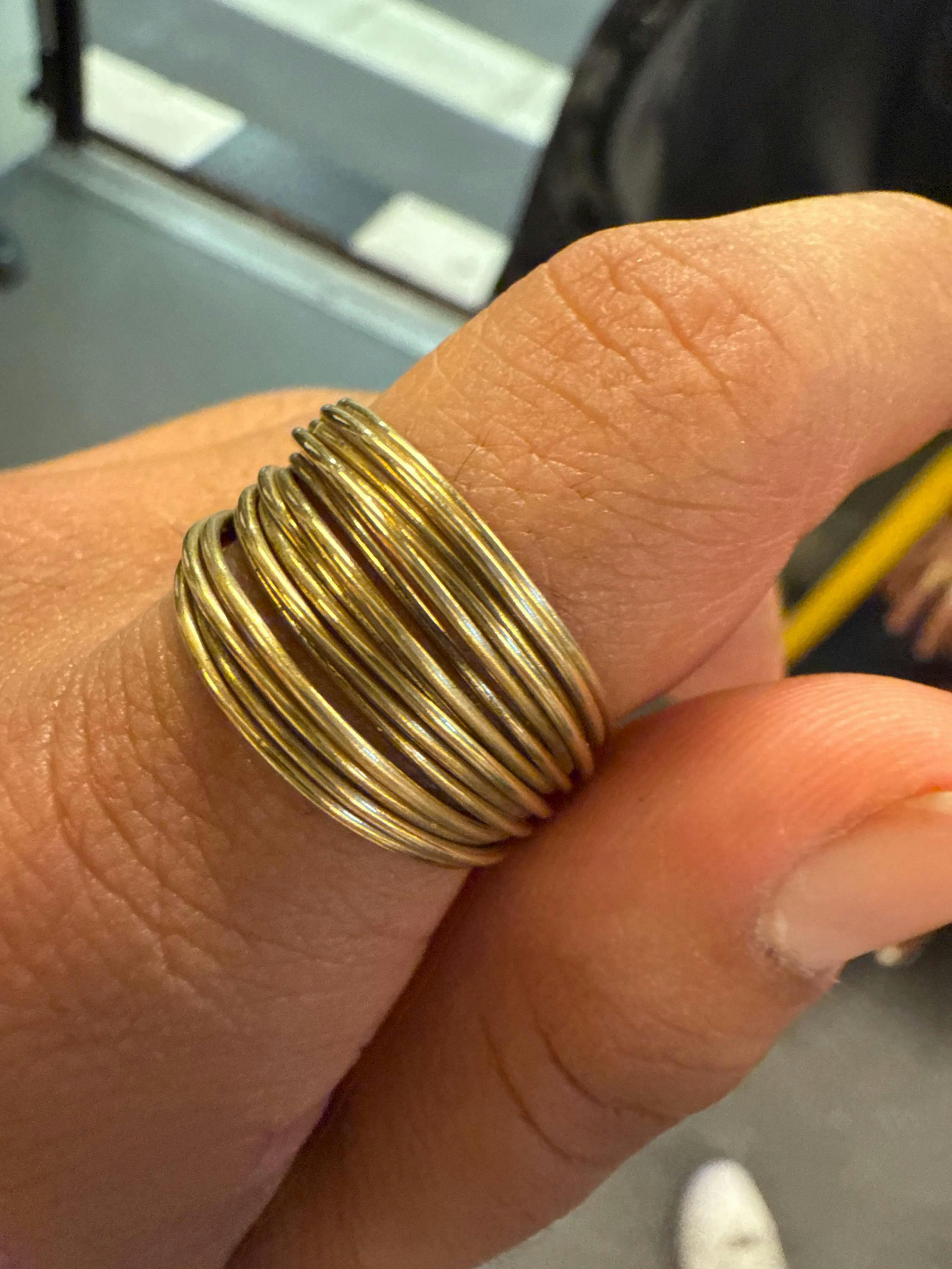 La bague est en laiton doré et s'adapte à tous les doigts ; c'est réglable.