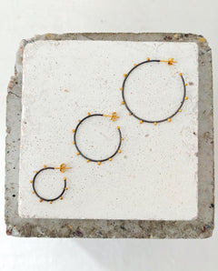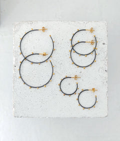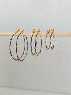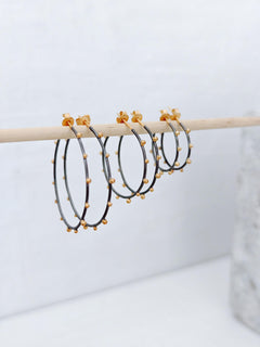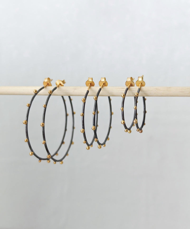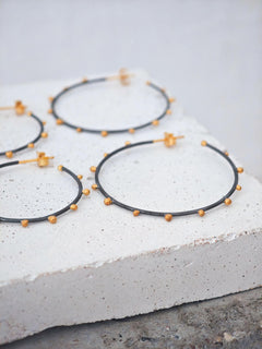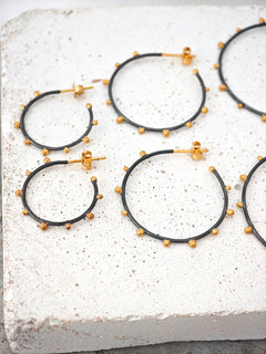Handgefertigte Creolen aus 925 Sterling Silber, schwarz rhodiniert und mit zarten, vergoldeten Punkten verziert.
