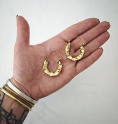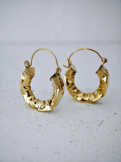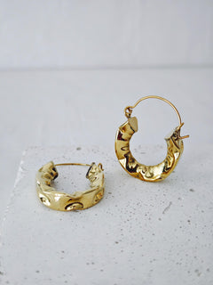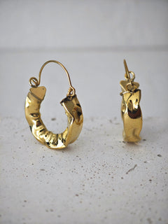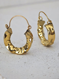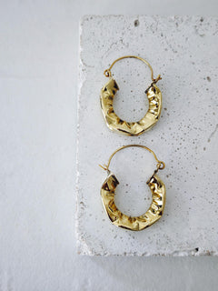 Diese kunstvollen Creolen aus goldfarbenem Messing sind echte Hingucker. Ihre strukturierte Oberfläche erinnert an geknittertes Papier – jeder Knick, jede Facette macht sie zu kleinen tragbaren Skulpturen. Das Licht reflektiert auf den unregelmäßigen Flächen und sorgt für einen besonderen Glanz – elegant, außergewöhnlich und mit einem Hauch Edgy.