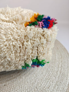 Marokkanischer Beni Ourain Pouf, Berber Bodenkissen geometrische Muster, Boho Sitzkissen aus Wolle bunt regenbogen, Vintage