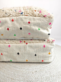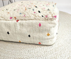 Marokkanischer Beni Ourain Pouf, Berber Bodenkissen, kleine Punkte, Boho Sitzkissen aus Wolle bunt regenbogen, Vintage