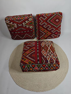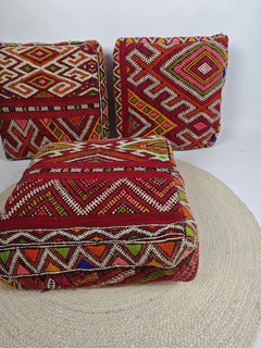 Die intensiven Rot-, Orange- und Naturtöne kombiniert mit geometrischen Berber-Mustern verleihen dem Pouf eine warme, lebendige Ausstrahlung mit authentischem Boho-Touch. Ein echtes Statement-Piece, das sofort Atmosphäre schafft und jedem Raum Tiefe und Persönlichkeit verleiht.