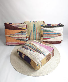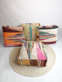 Jeder Pouf dieser Kollektion ist ein absolutes Einzelstück. Sorgfältig geschneidert, von Hand geknüpft und genäht – kein Muster, keine Farbkombination wiederholt sich.