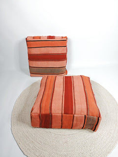 Marokkanischer Pouf mit Streifen Muster, Berber Bodenkissen bunt, Boho Sitzkissen aus Wolle Rosa und Orange, Vintage Kelim Bodenkissen
