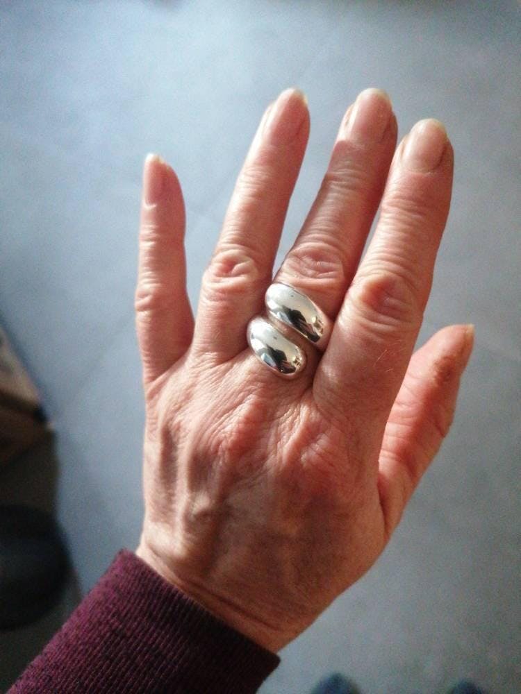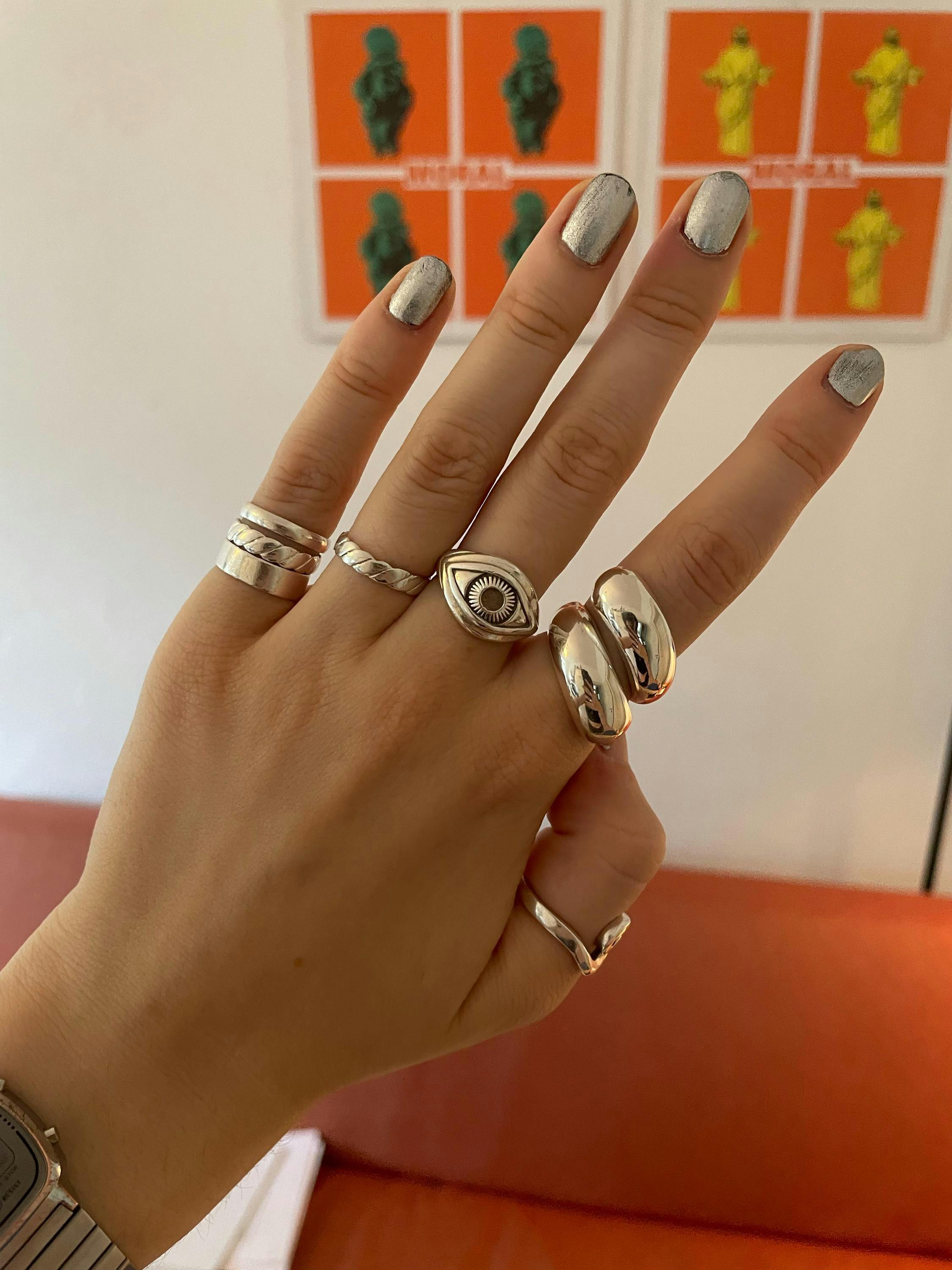 Wie geschmolzenes Silber umschließt er den Finger – clean, elegant und mit einem coolen Retro-Touch.