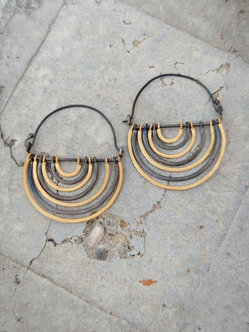 Statement Regenbogen Ohrringe schwarz rhodiniert und vergoldet , handgefertigte Creolen, große Rainbow Hängeohrringe